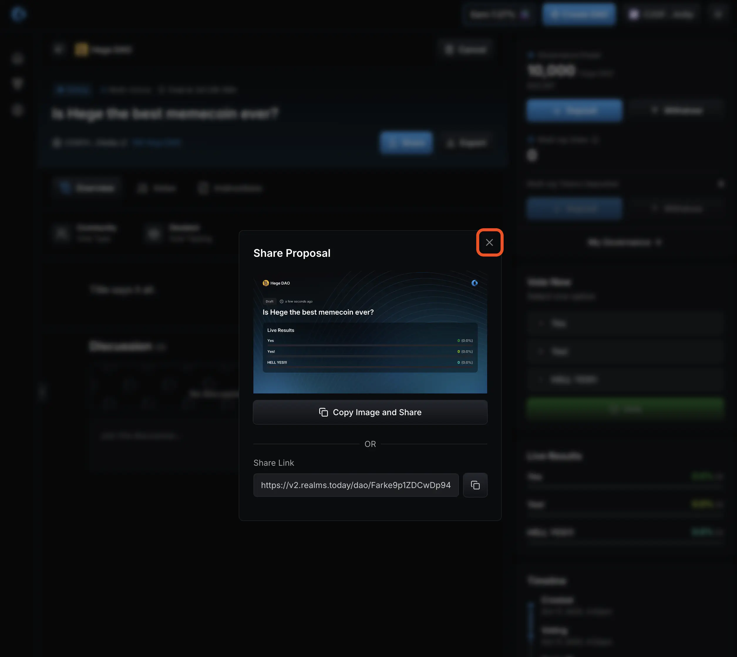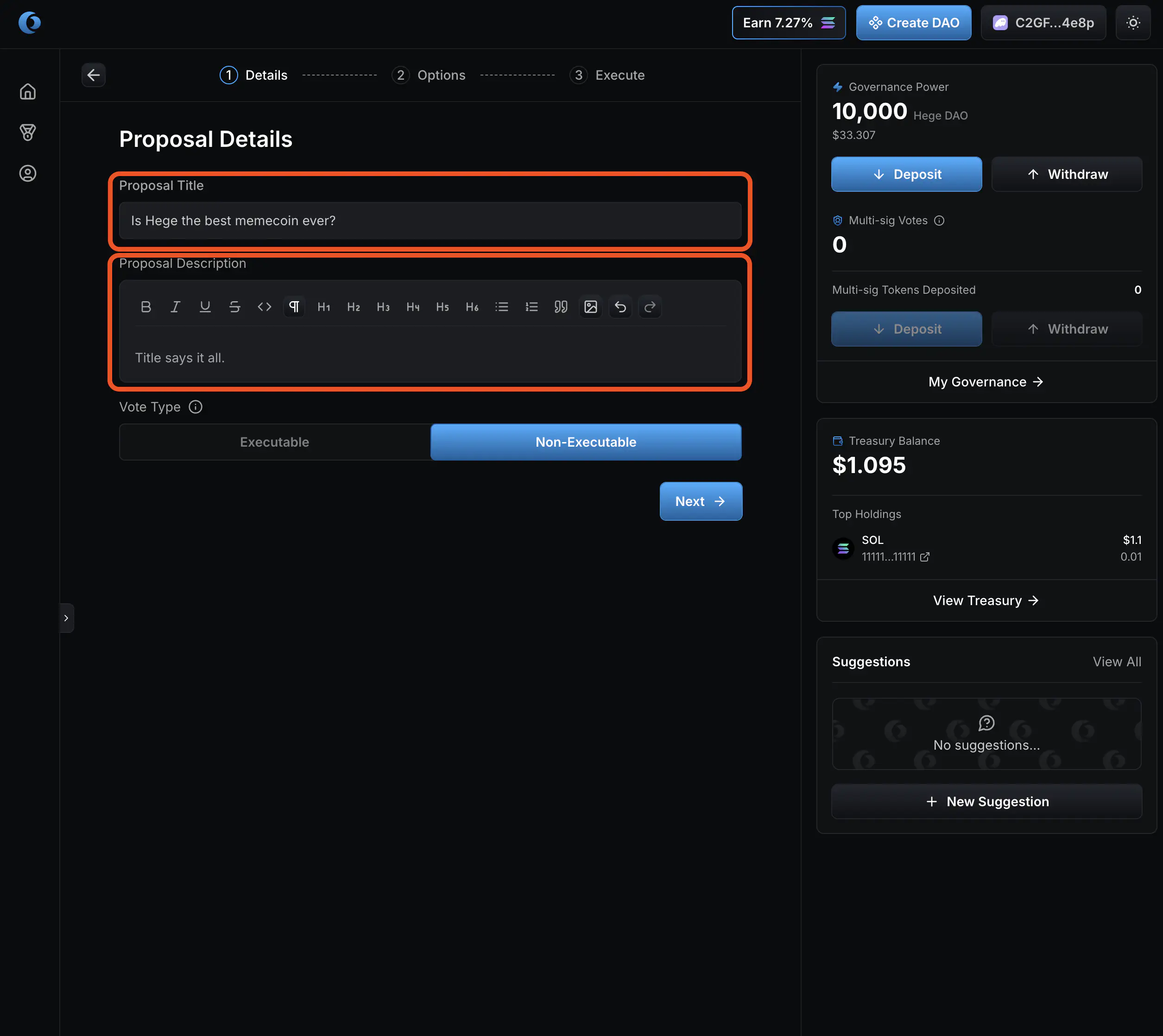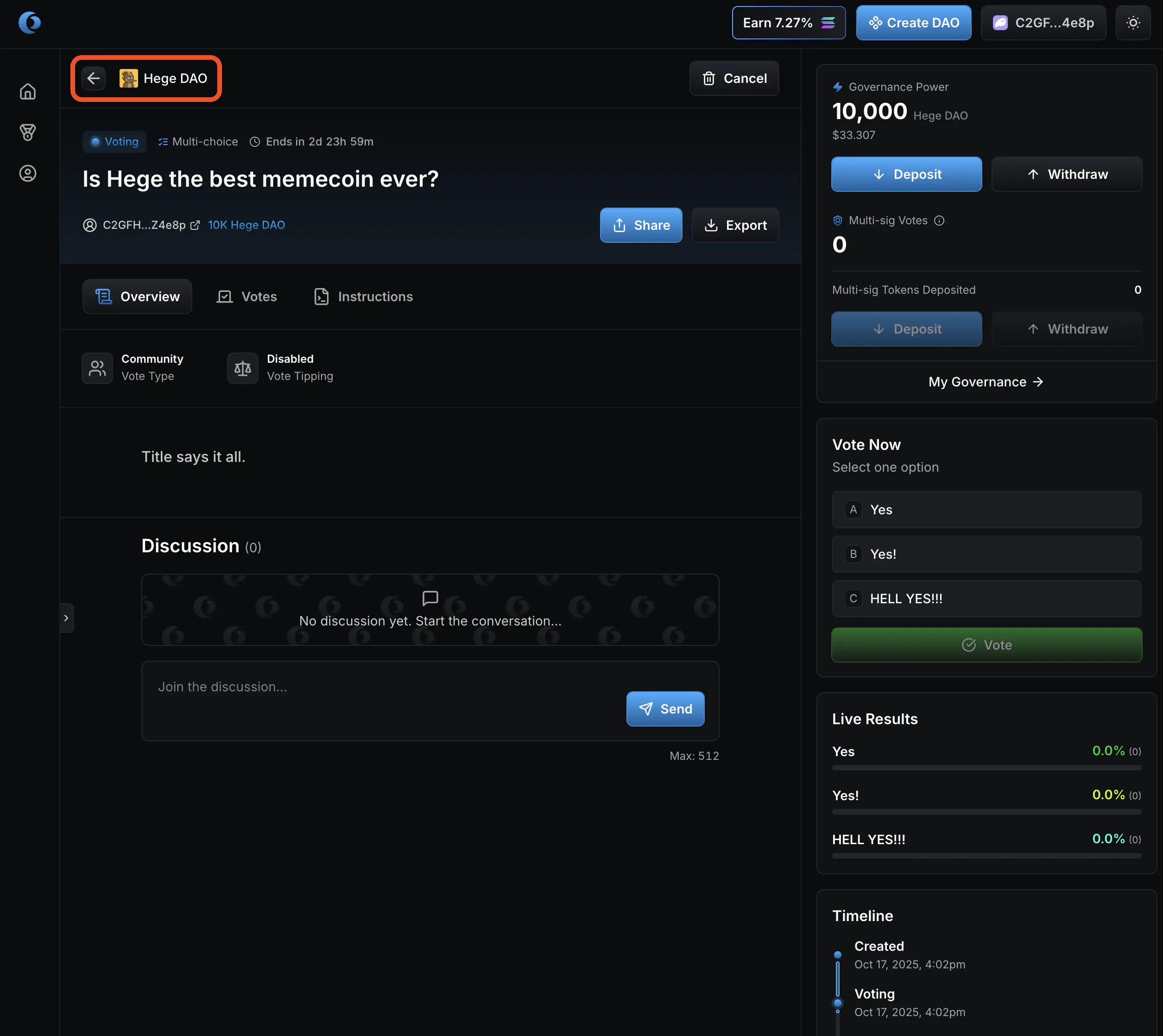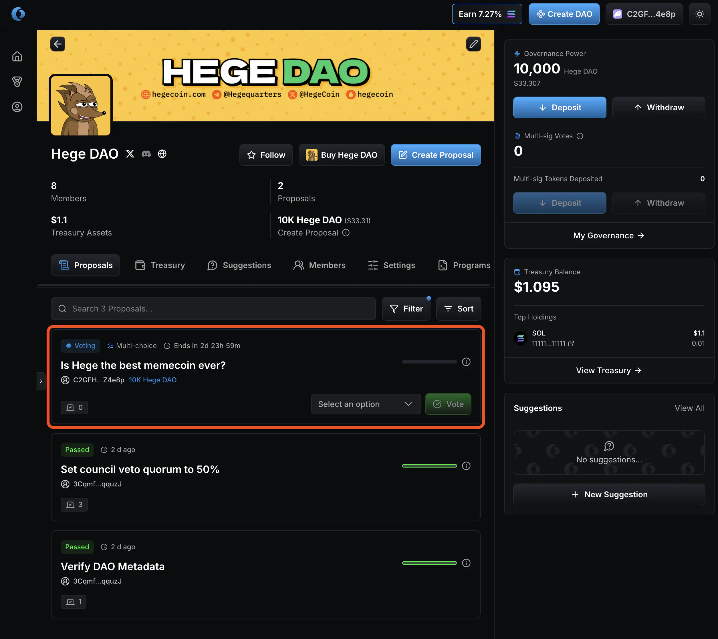 1. That’s it! Your proposal is created and open for voting. Now go share it with the Hege community! And don’t forget to vote on your proposal. See How to Vote in the Hege DAO if you need help with that.