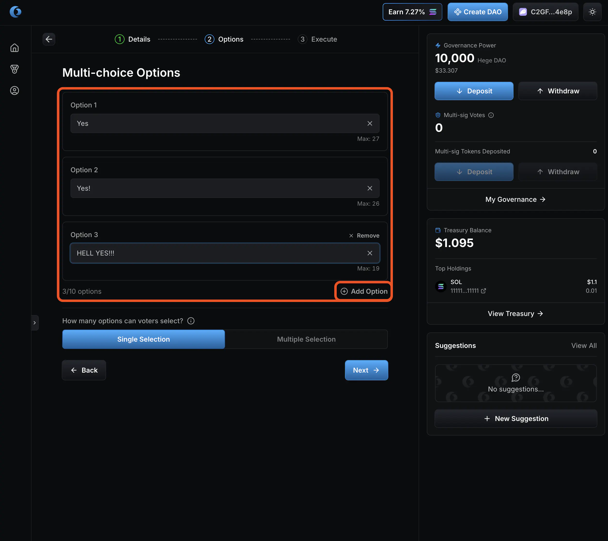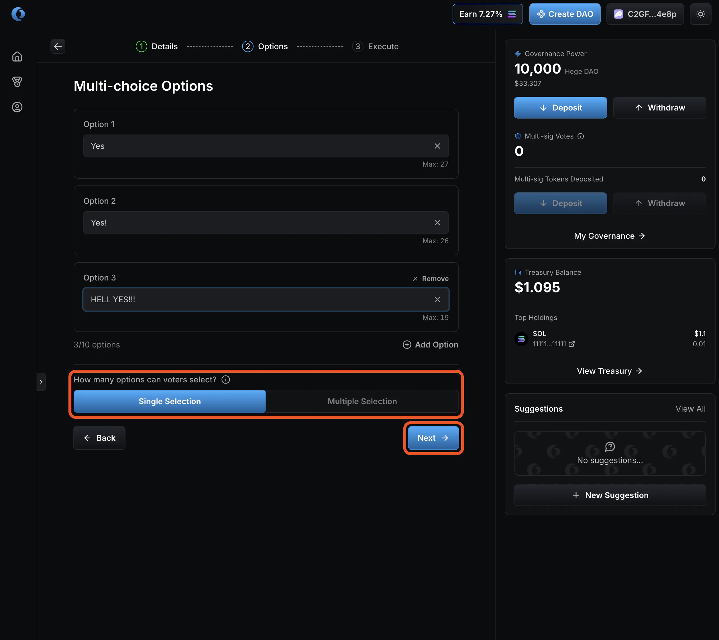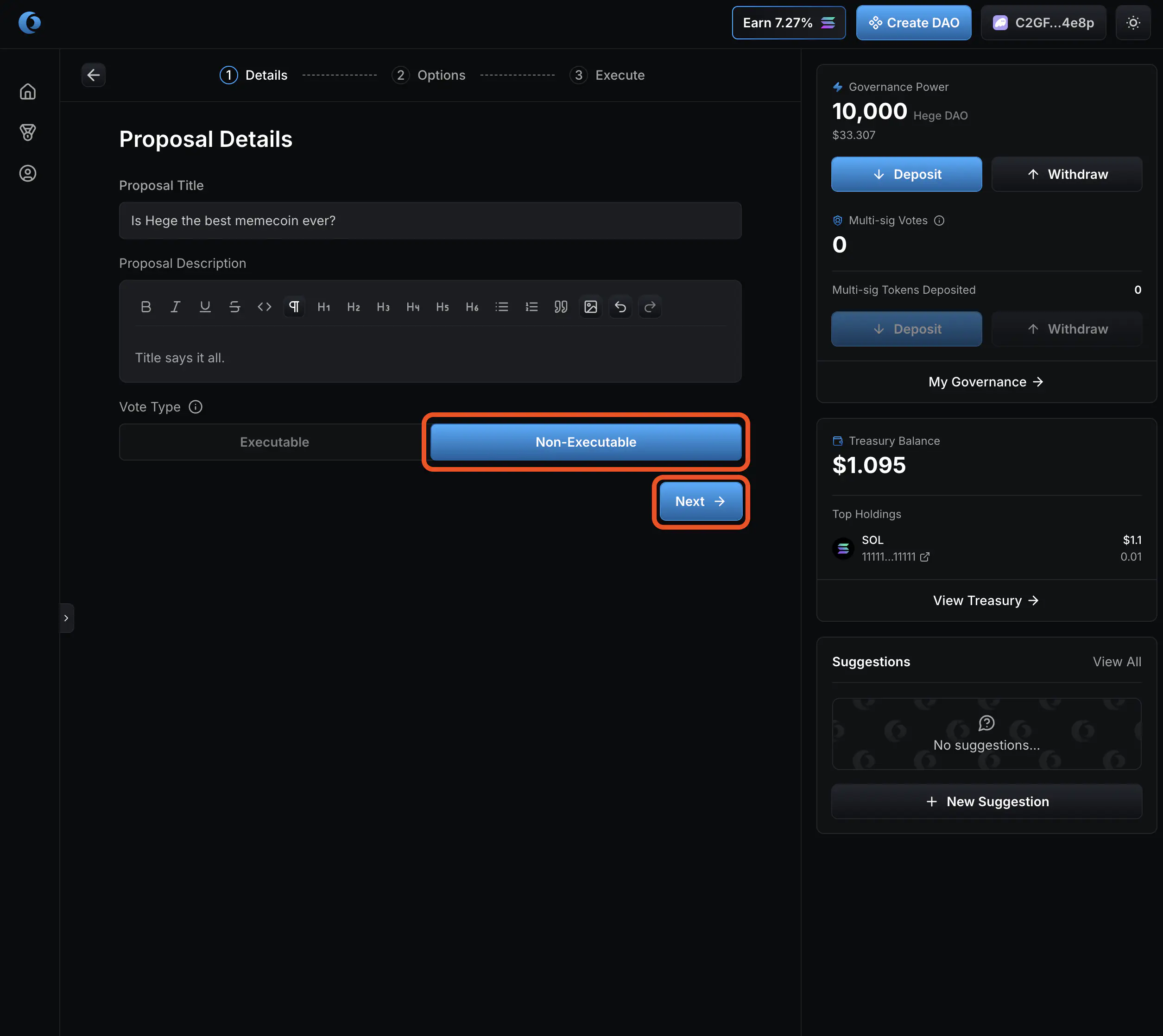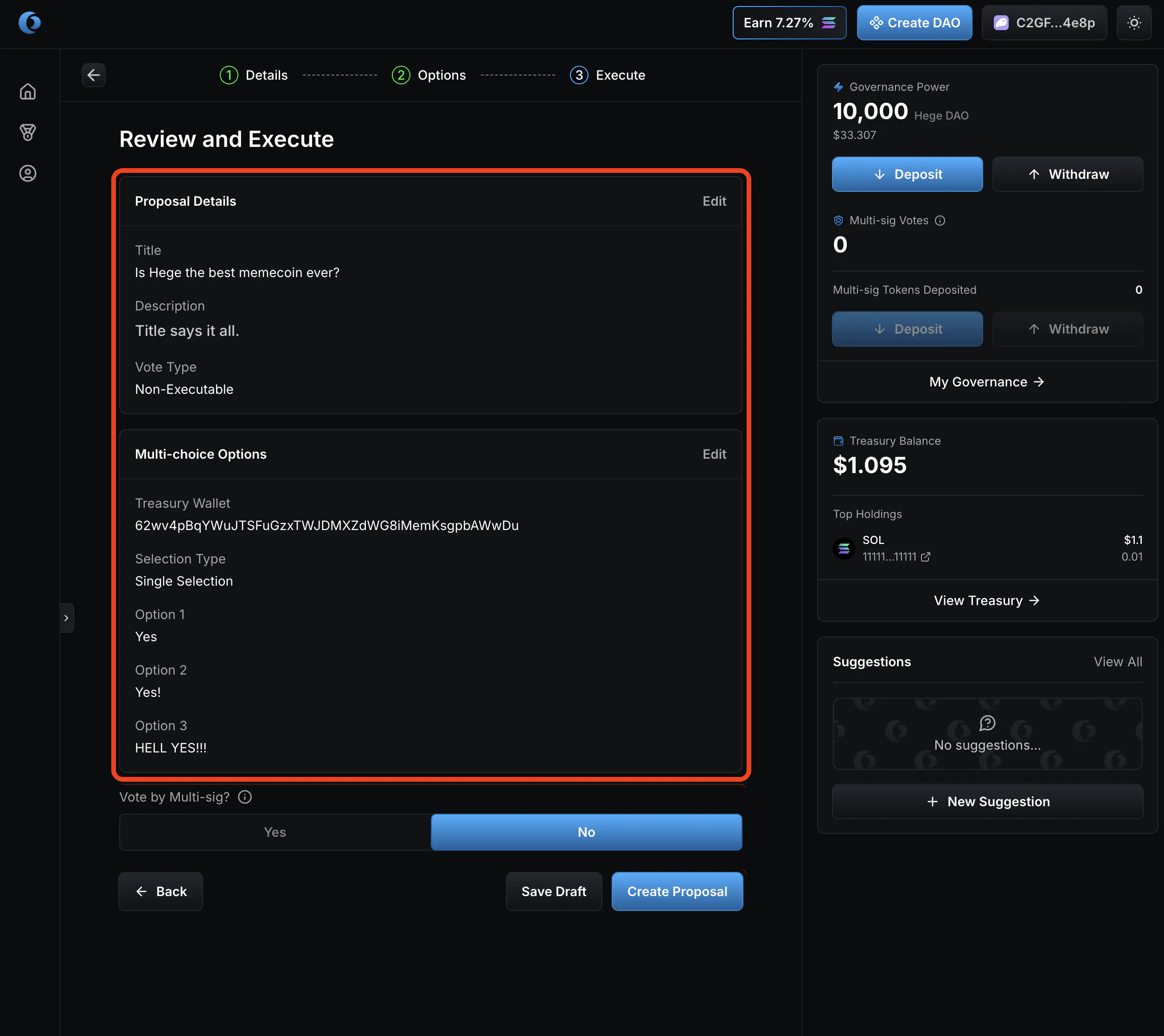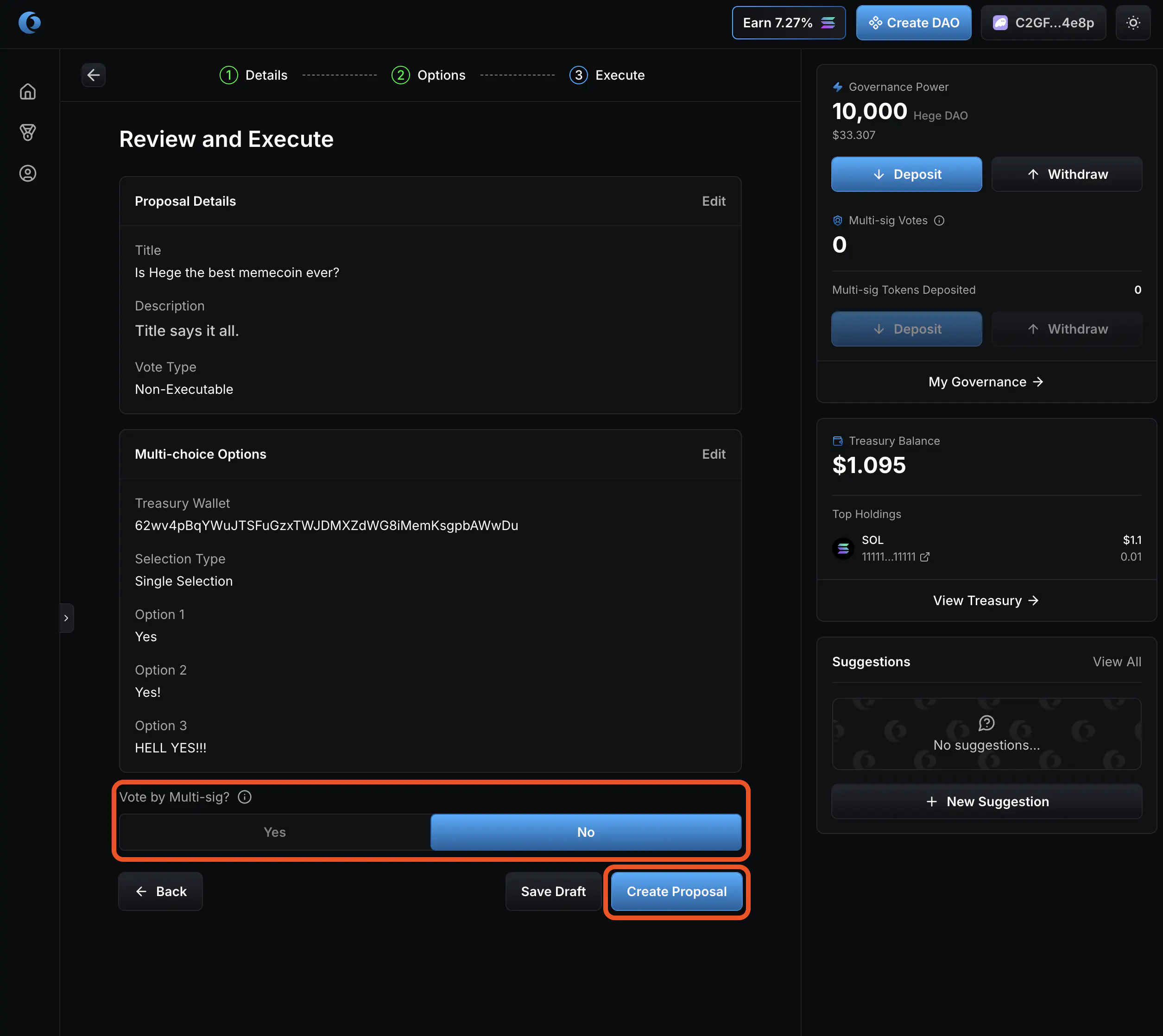 1. Select “No” on vote by multi-sig. Then click “Create Proposal”.