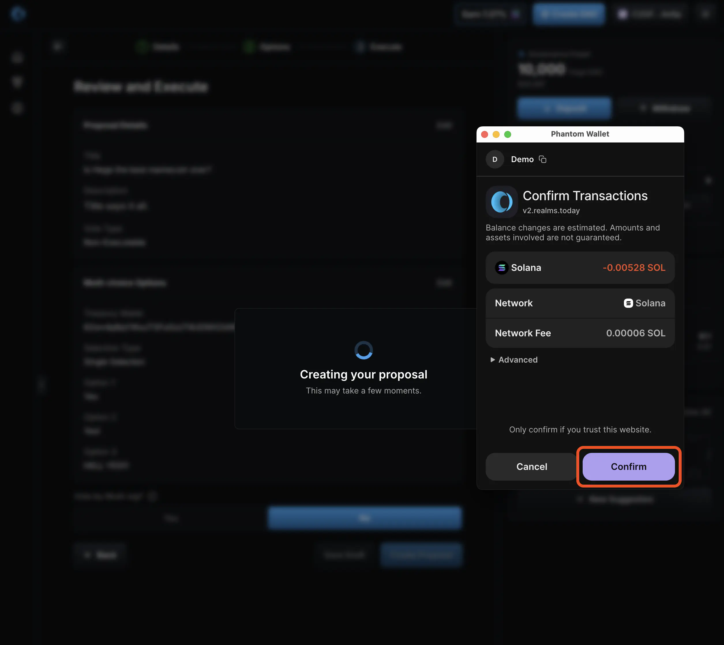 1. Confirm the transaction in your Solana wallet.