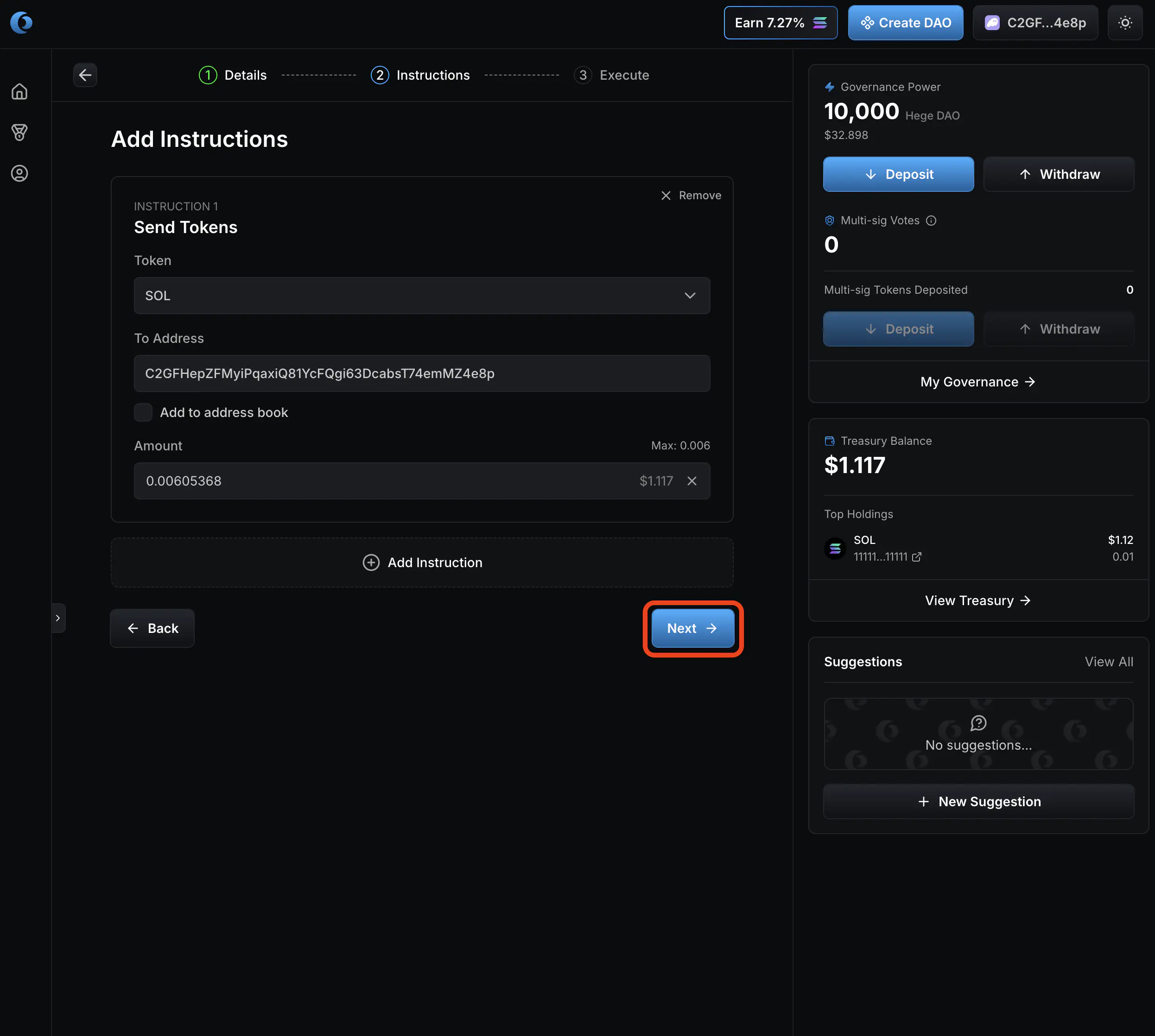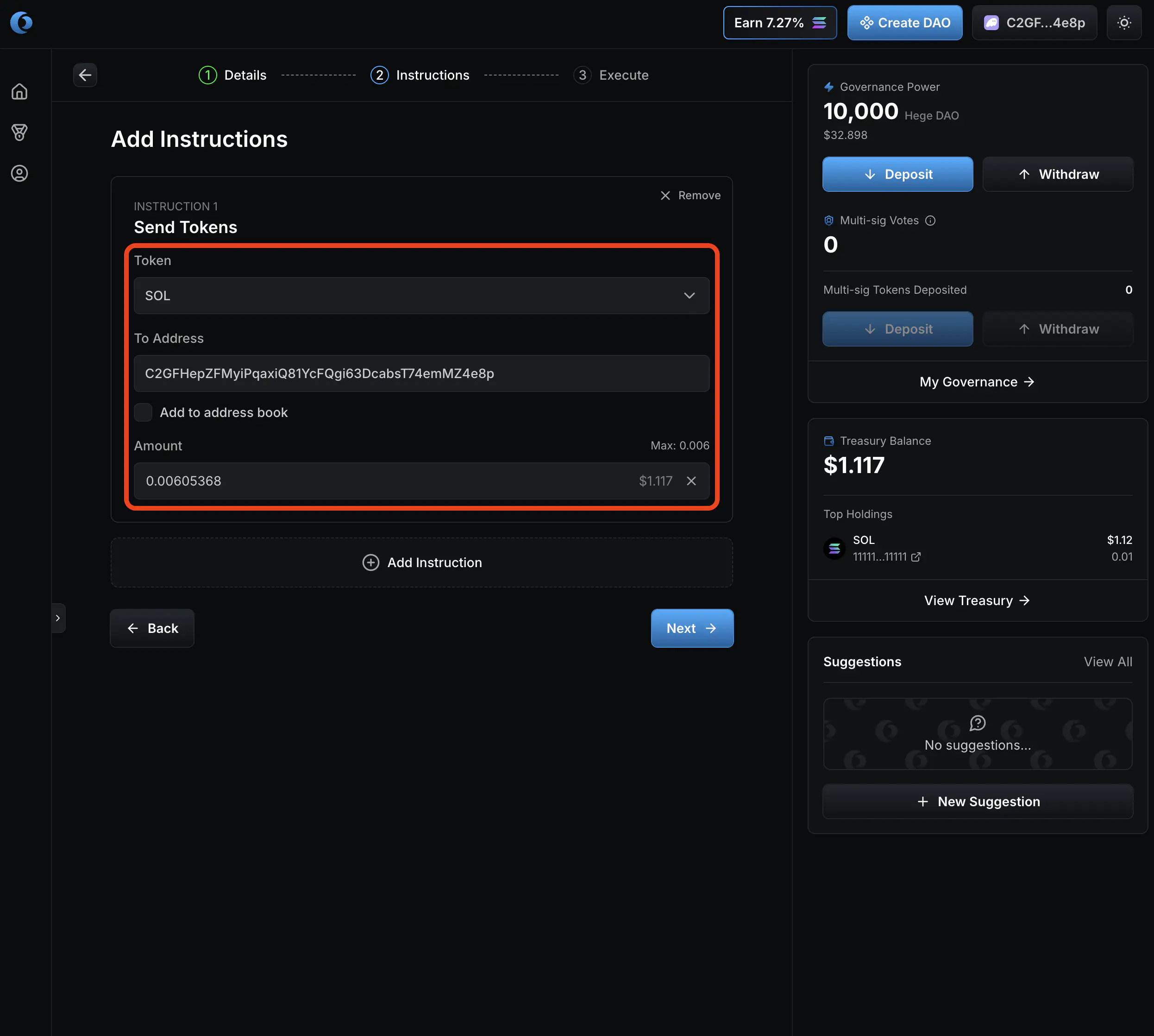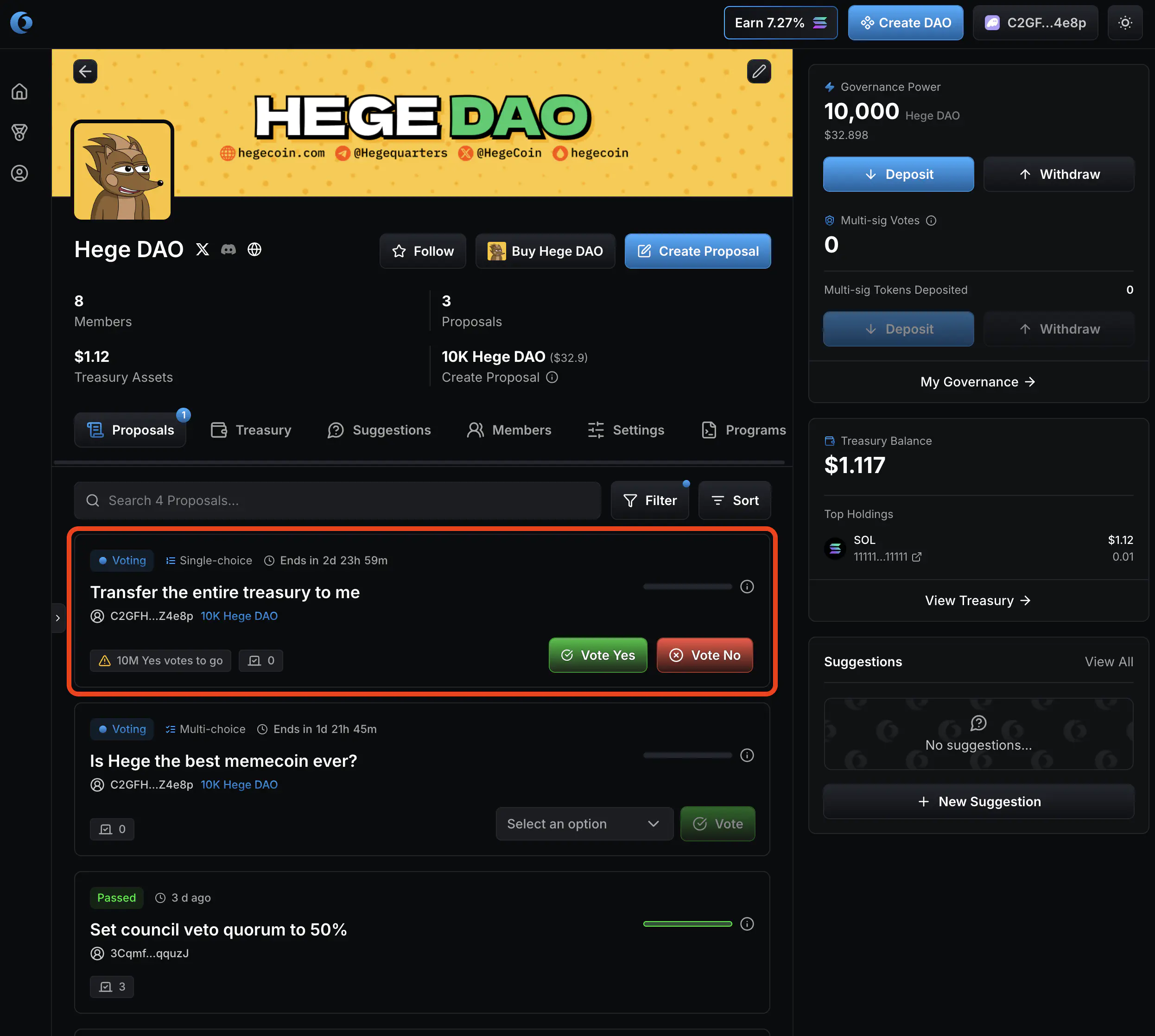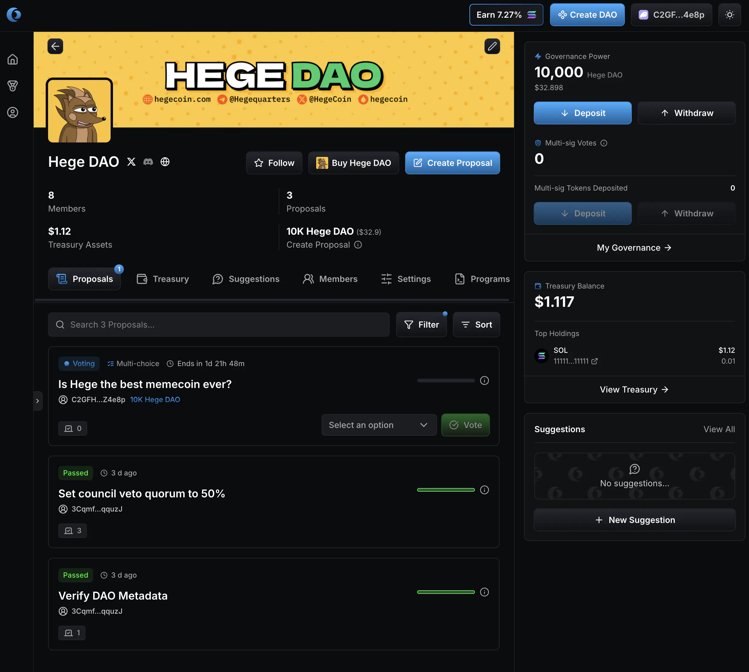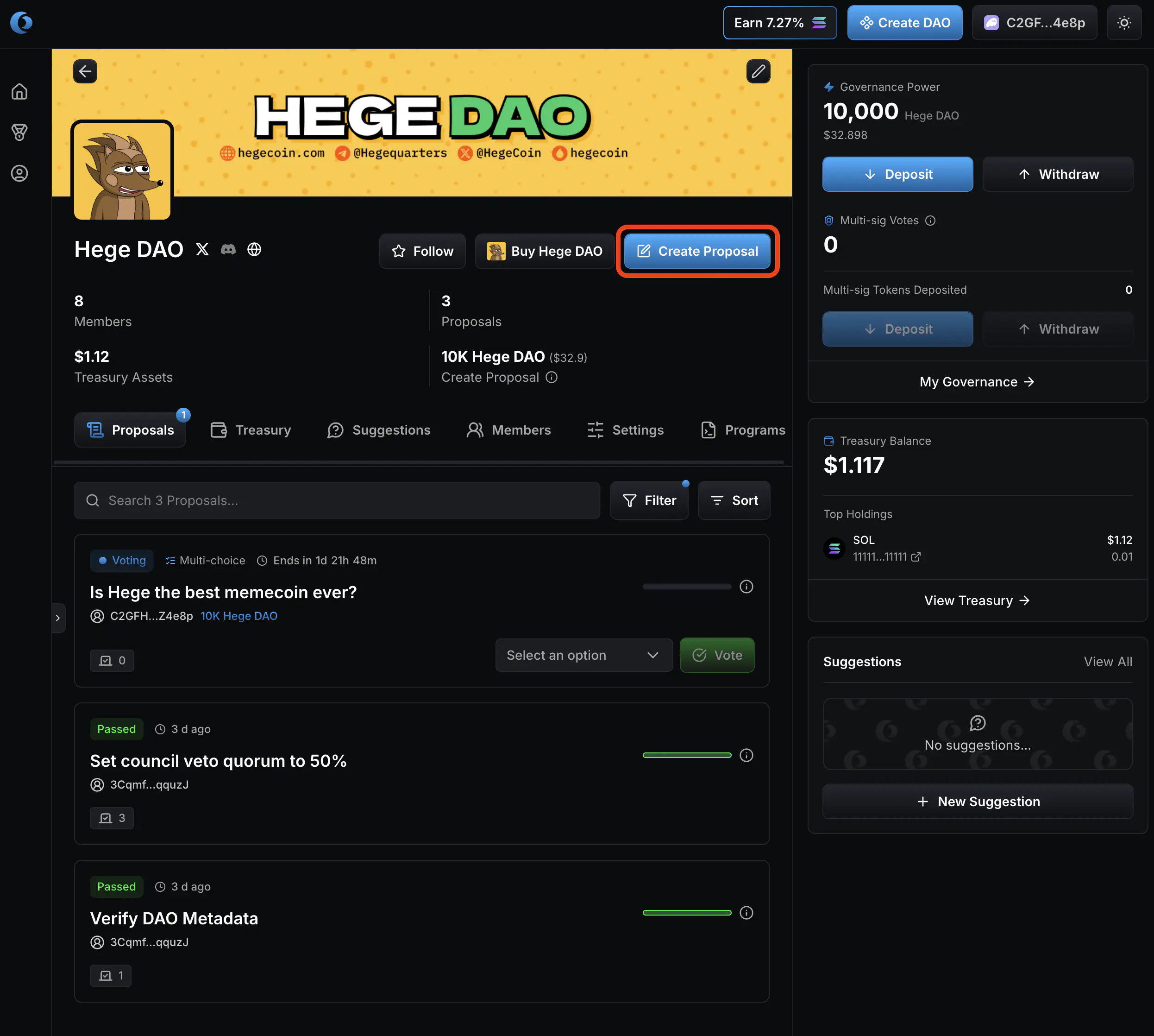 1. Go to the Hege DAO page on Realms. Connect your wallet. It should look something like this. You can see how many $HEGE tokens you have deposited in the upper right corner, right next to the banner. (NOTE: You must have at least 10,000 $HEGE deposited to make a proposal. See How to Deposit and Withdraw to learn how to deposit tokens.)