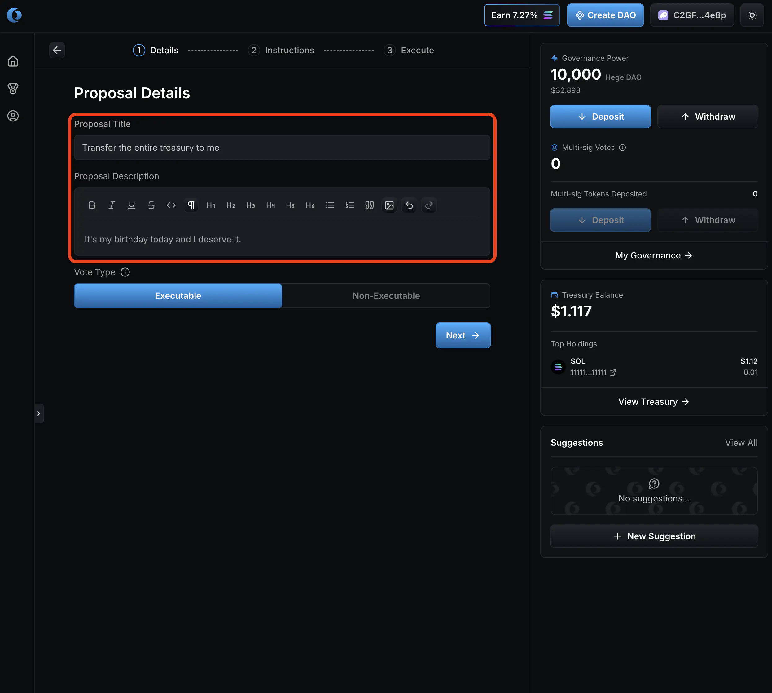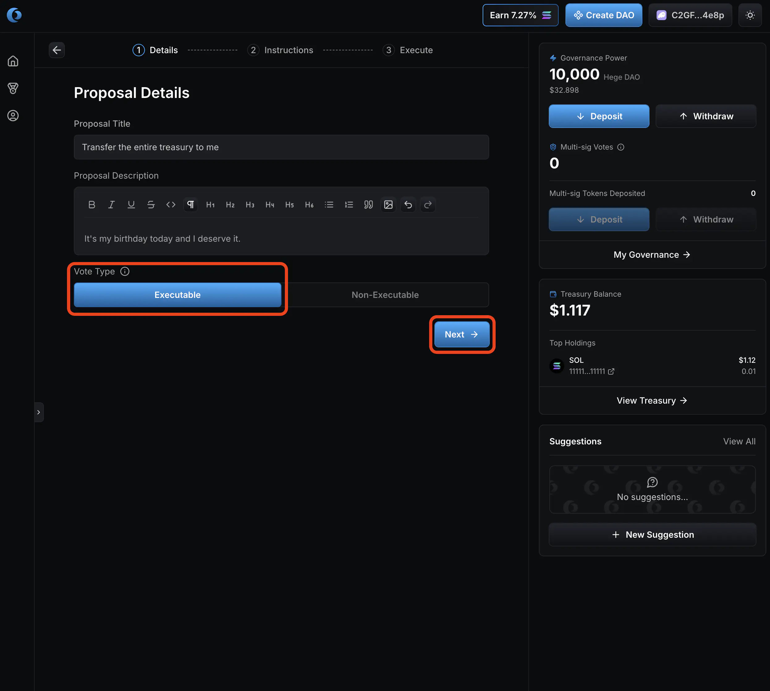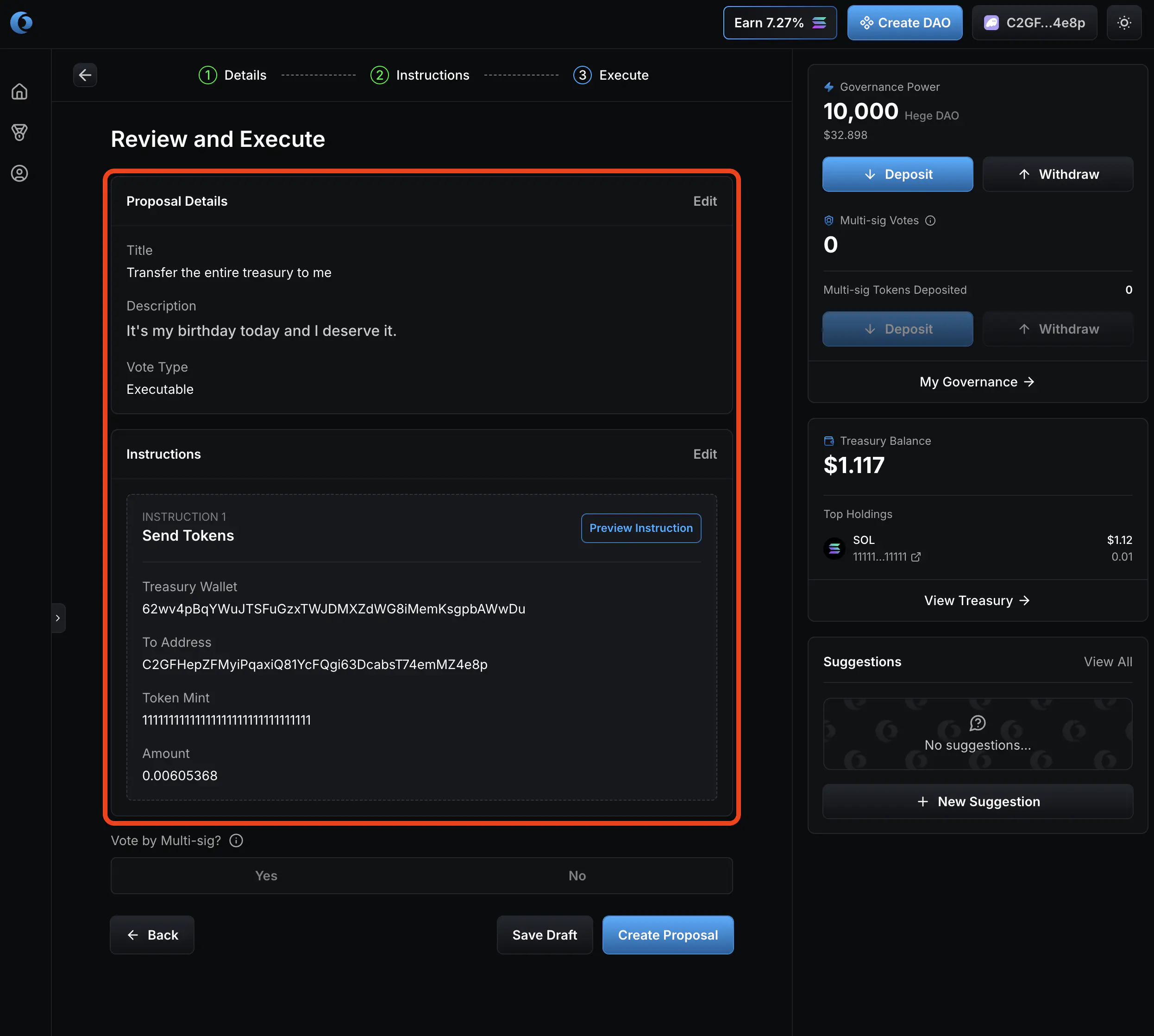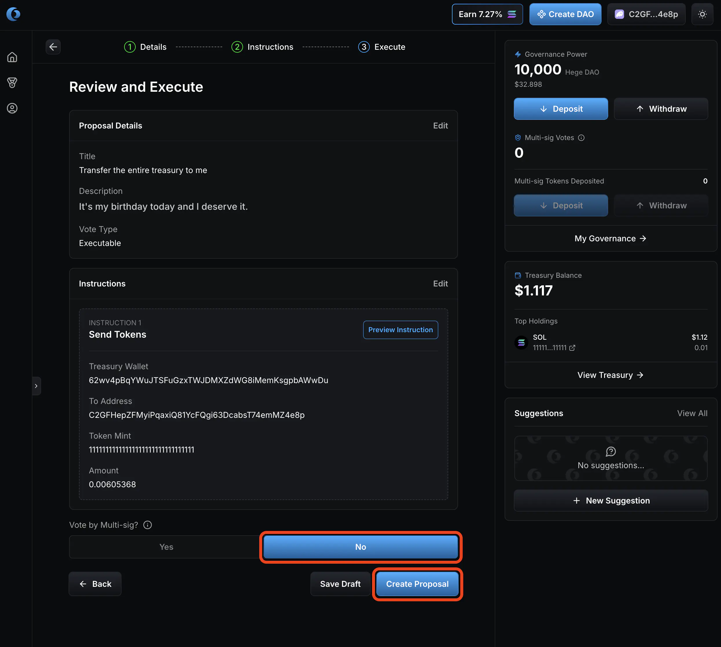 1. Select “No” on vote by multi-sig. Then click “Create Proposal”.