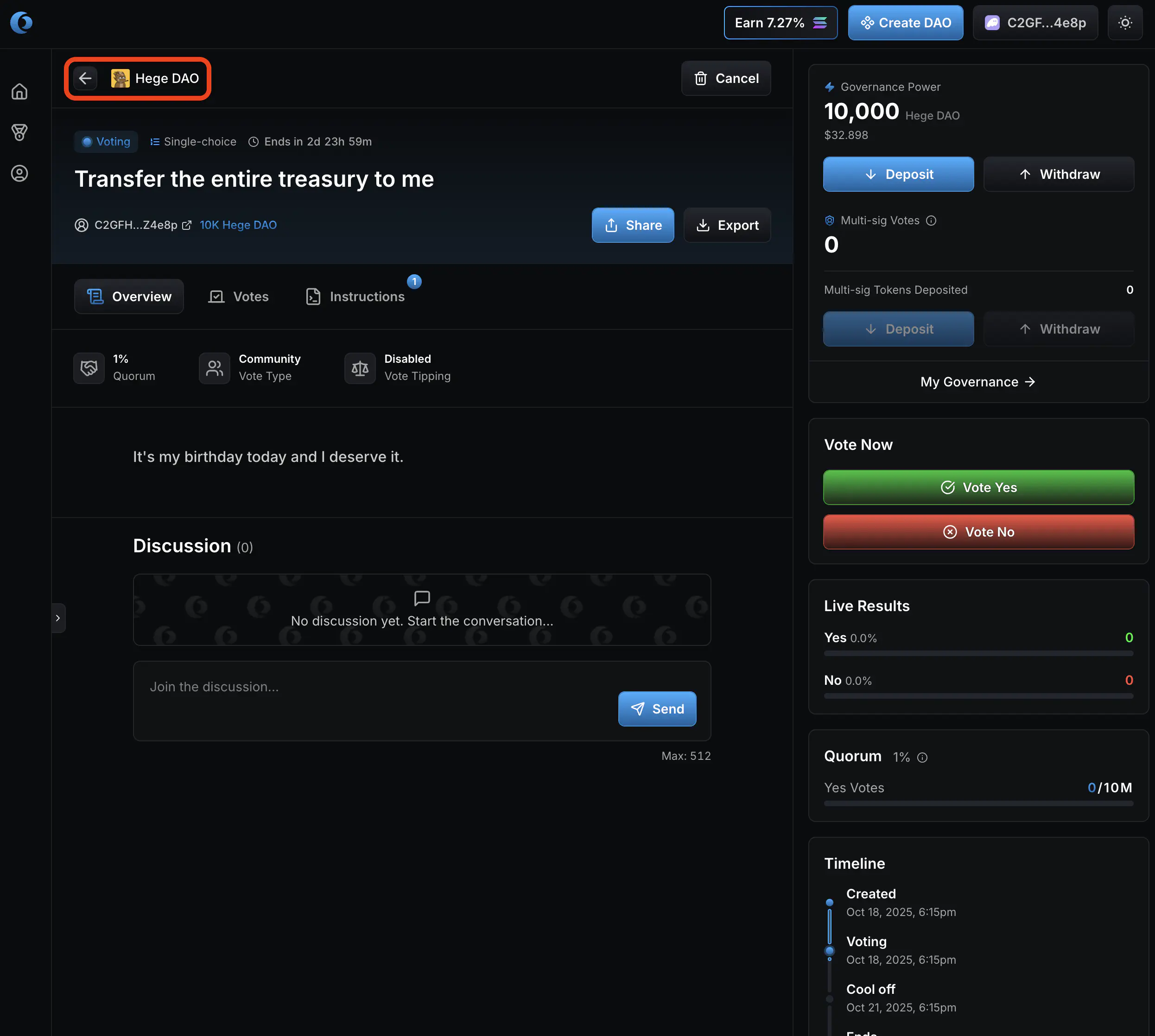 1. That’s it! Your proposal is created and open for voting. Now go share it with the Hege community! And don’t forget to vote on your proposal. See How to Vote in the Hege DAO if you need help with that.