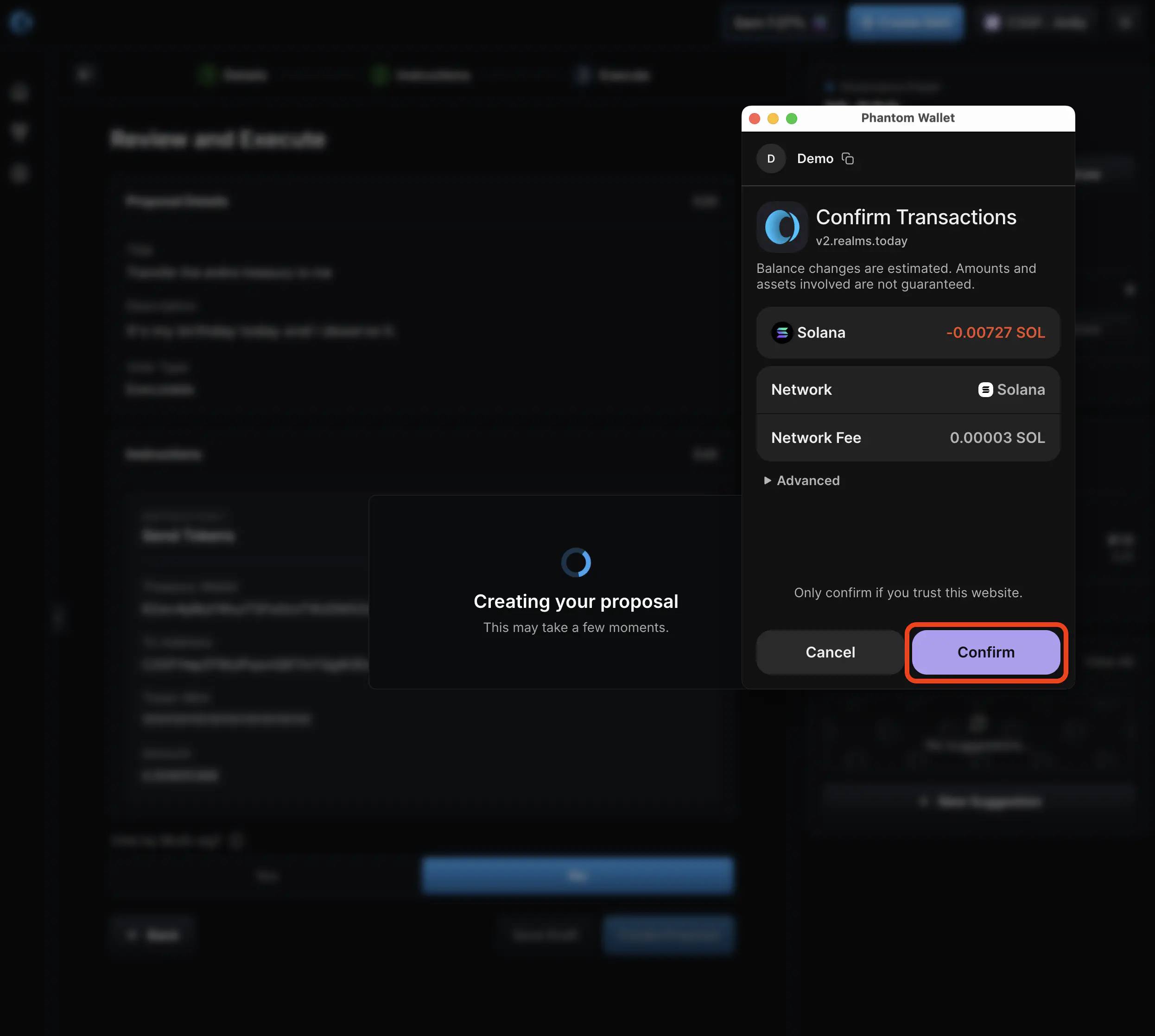 1. Confirm the transaction in your Solana wallet.