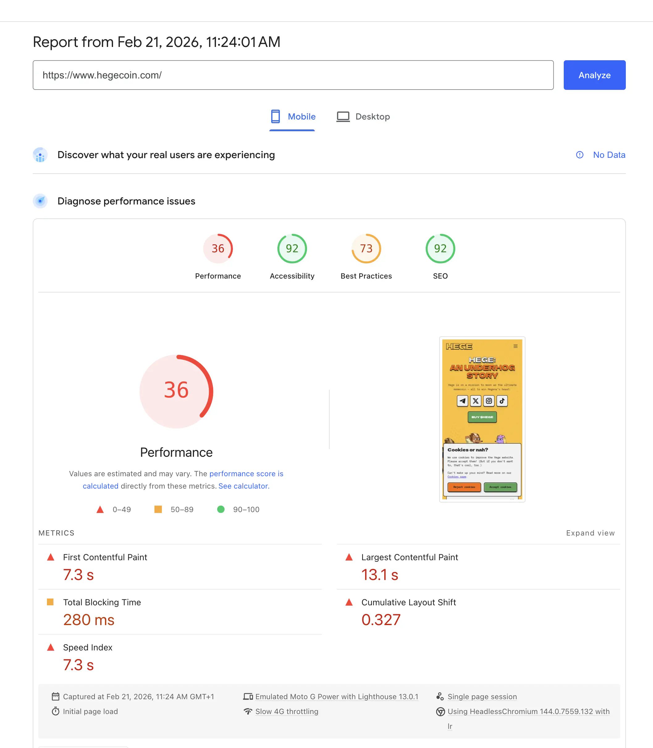 PageSpeed score: 36 performance, 92 accessibility, 73 best practices, 92 SEO