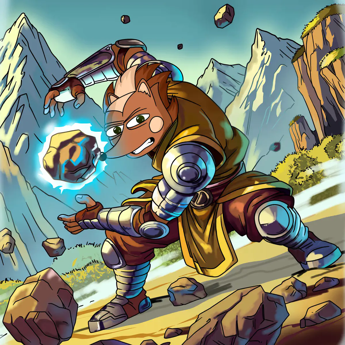 Cartoon Hege clad in armor made of steel and heavy brown fabric, spinning a rock in a force field between his hands, against a backdrop of high mountains.