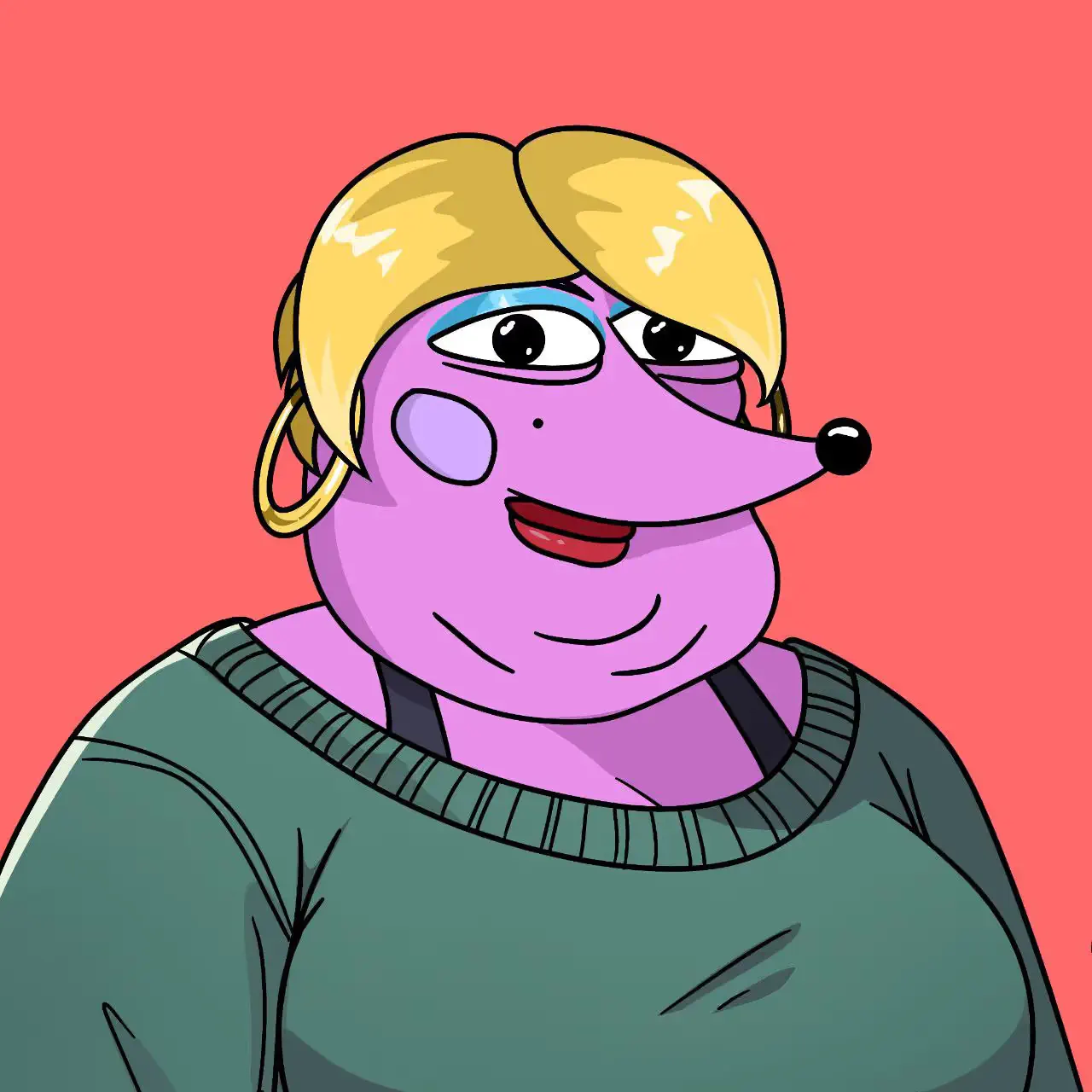 Profile picture of Helena, a purple anthropomorphic hedgehog, dressed in a green cardigan, sporting a distintively Karen blond hairdo and large golden earrings.