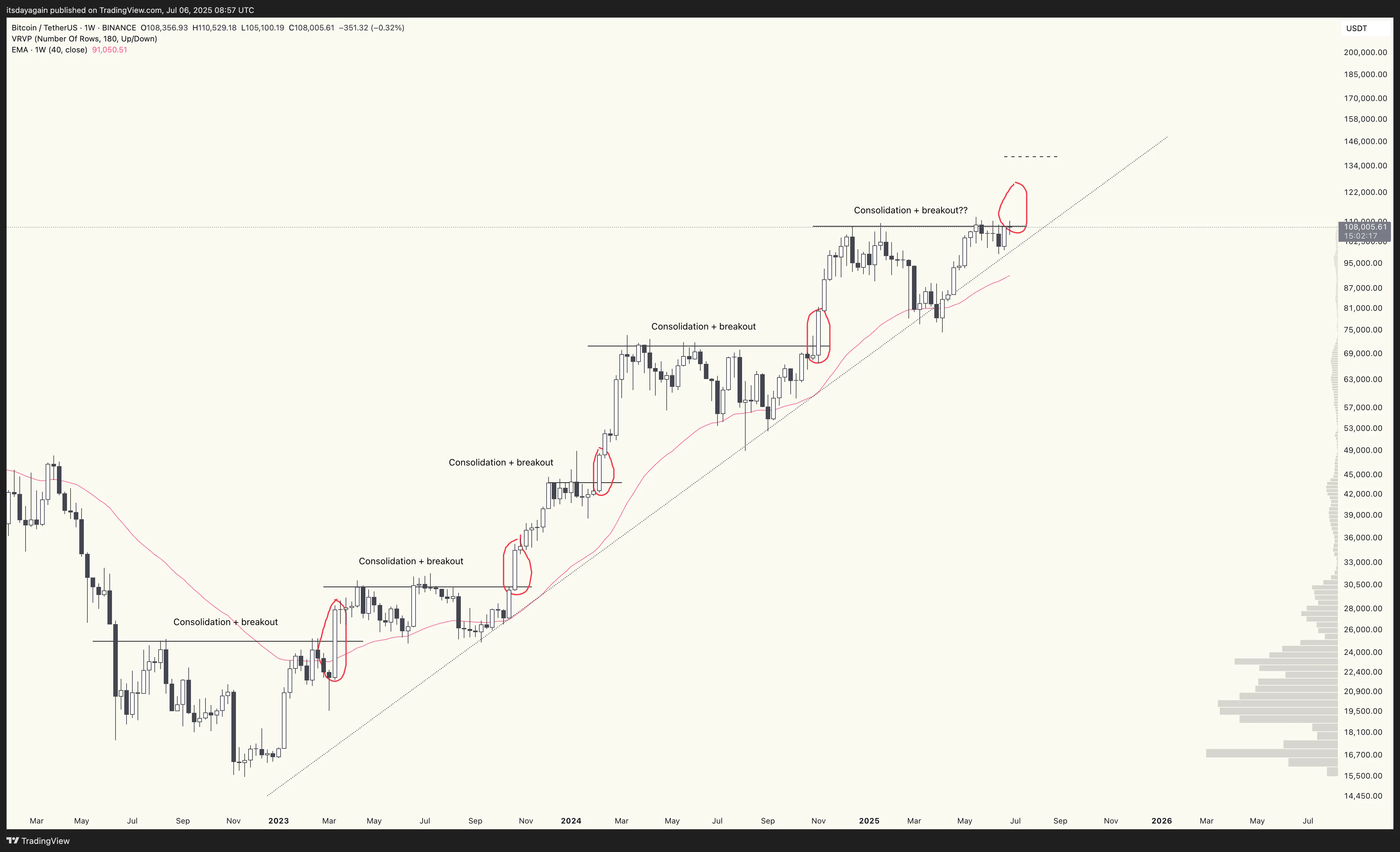 Our resident TA geek @itsdayagain shares this weekly BTC chart. He says we want to see a strong weekly breakout candle to complete the current consolidation period and move on to the next leg up. Looking back, this pattern of consolidation followed by a breakout has repeated 4 times since the bottom in 2022. Odds are it will repeat for a 5th time.