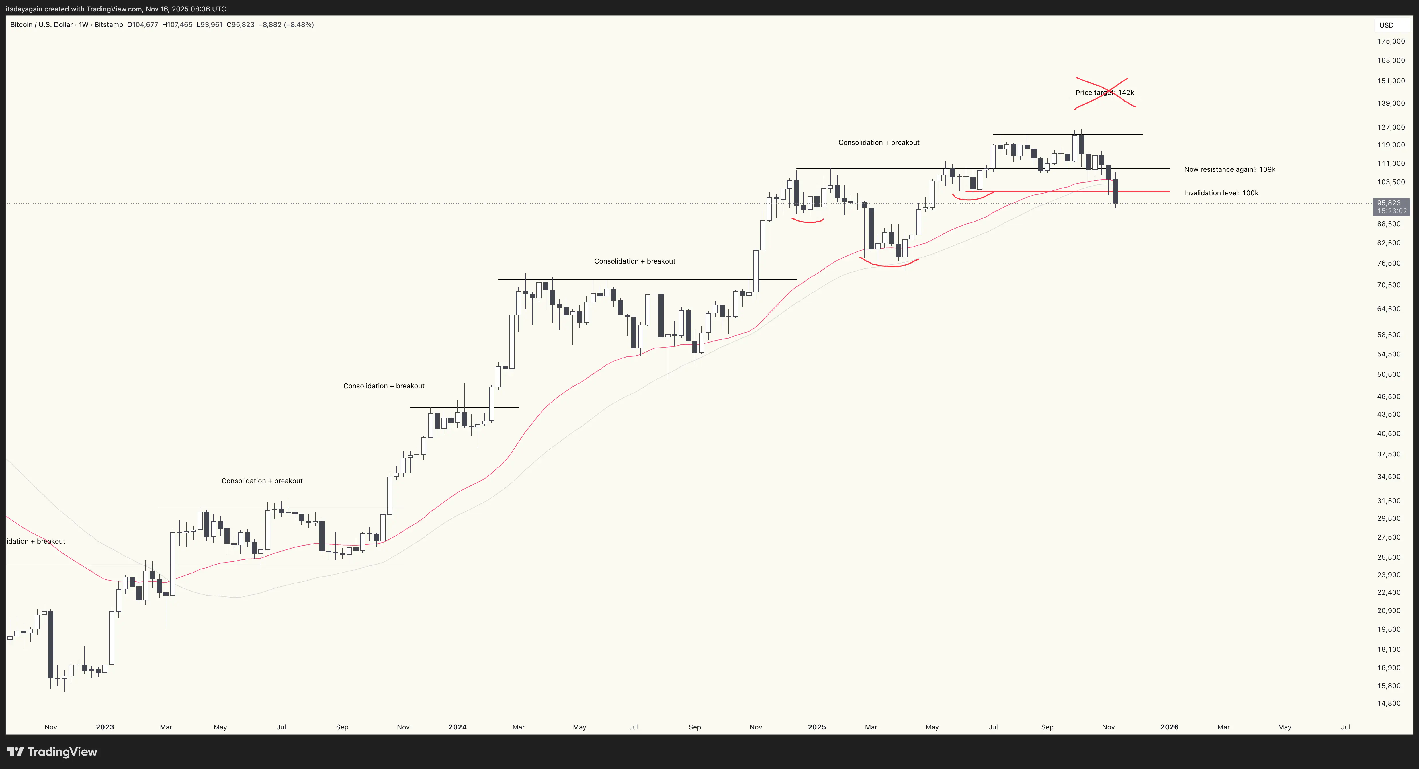 The week is not over yet, but it looks likely that bitcoin will close well below $100k this week, after holding it last week. This means a close below the 40 week EMA, below the 50 week SMA, and below the invalidation level for the July breakout.