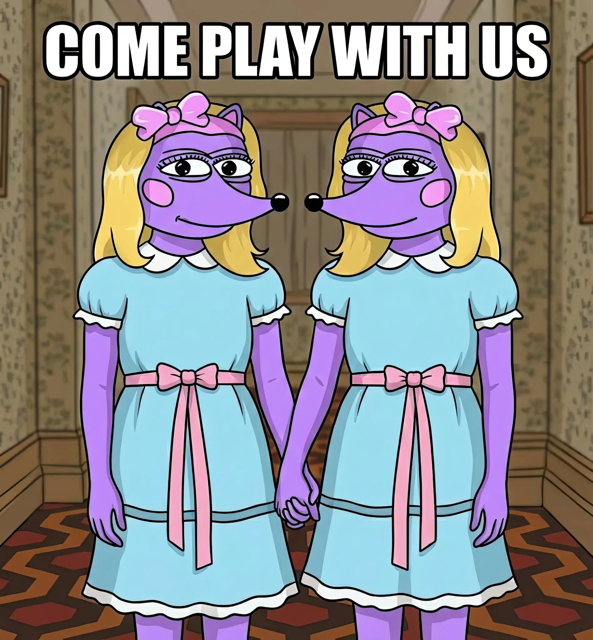 Hegena identical twins, in turquoise dresses, holding hands