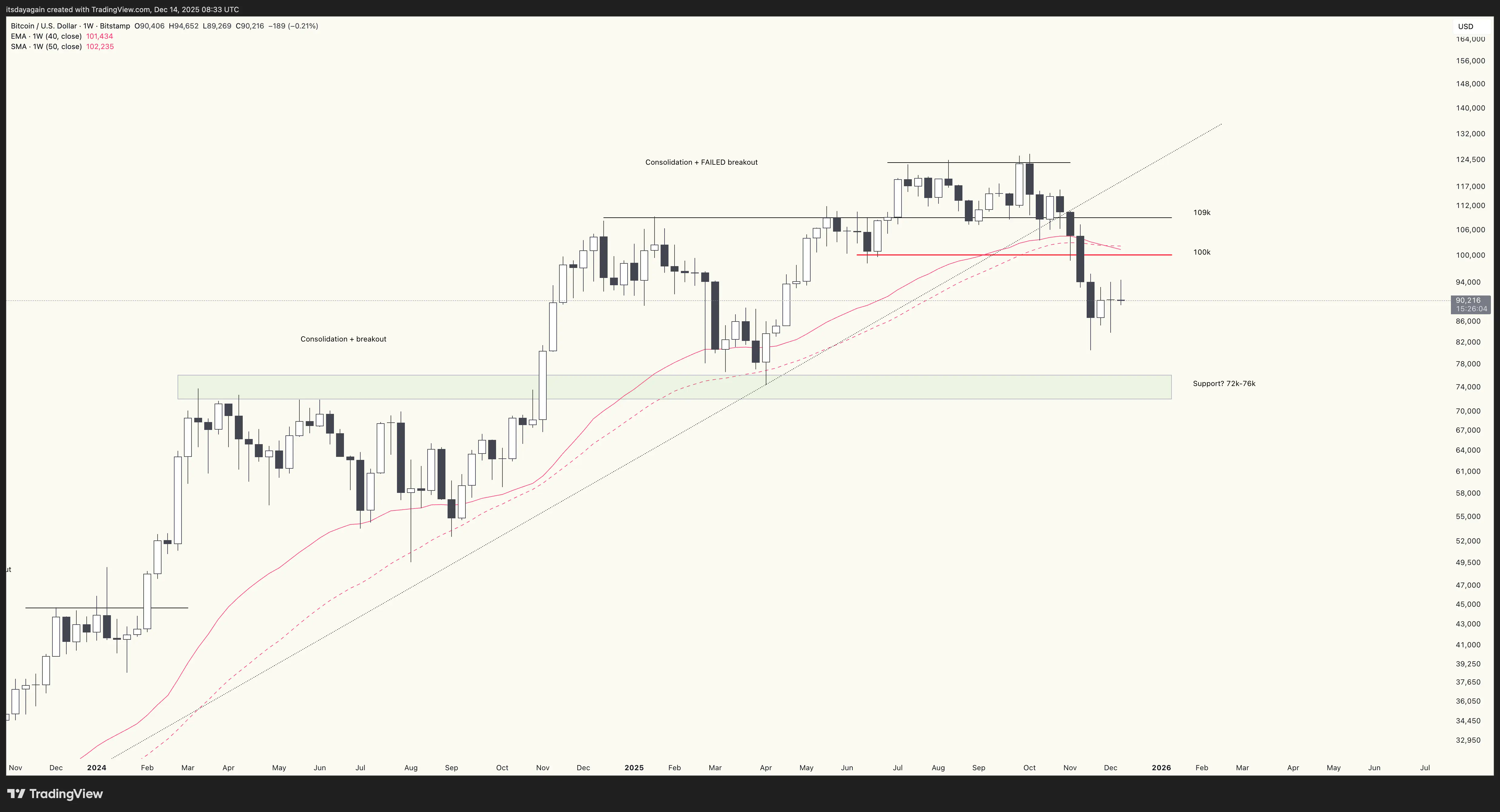 BTC/USD weekly chart, 14 December 2025. Bouncing from $81k. Resistance at $100k and $109k. Support at $72k-76k.