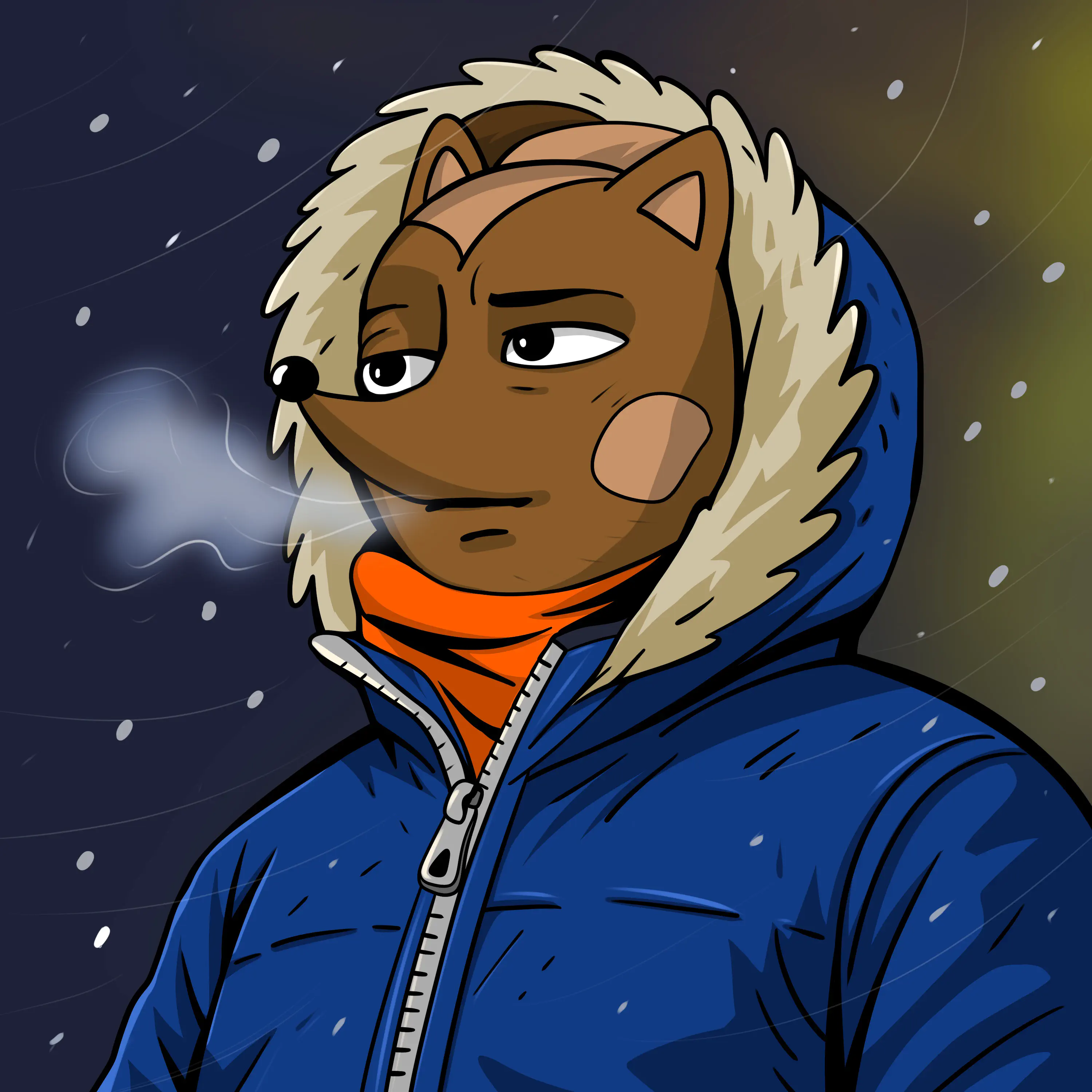 Hege in a blue down jacket with fur-lined hood, the winter cold turning his breath into a cloud of frozen vapor