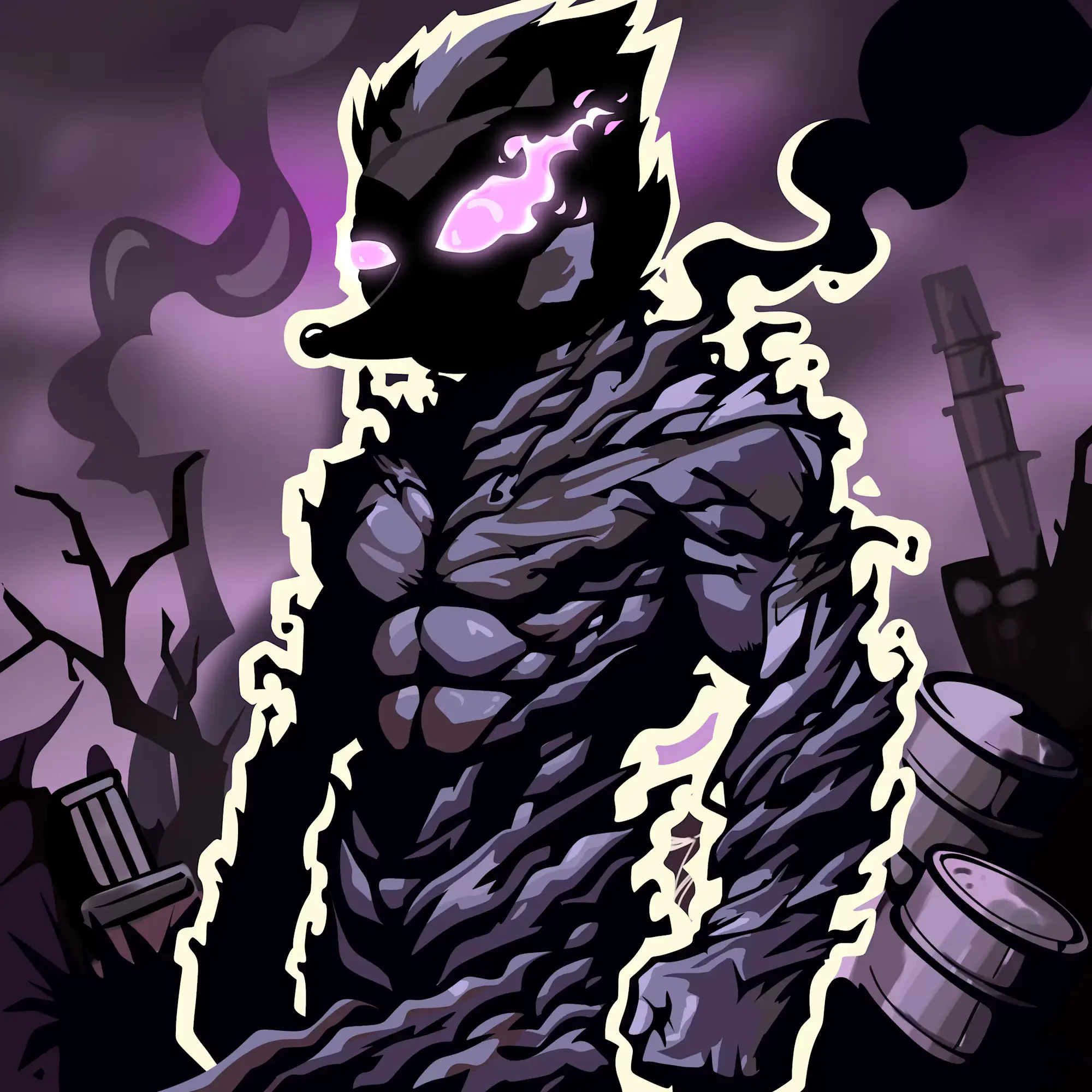 A purple and black drawing showing a dark muscular Hege with glowing eyes, set against a post-apocalyptic industrial wasteland.